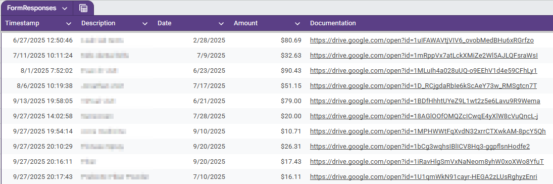 Already your form will collect submissions and store them in a Google Sheet. But the way it stores file attachments is a mess. So we’ll add a Google Apps Script to automatically organize the files and rename them consistently so we can tell even in the folders which files go with which expenses.