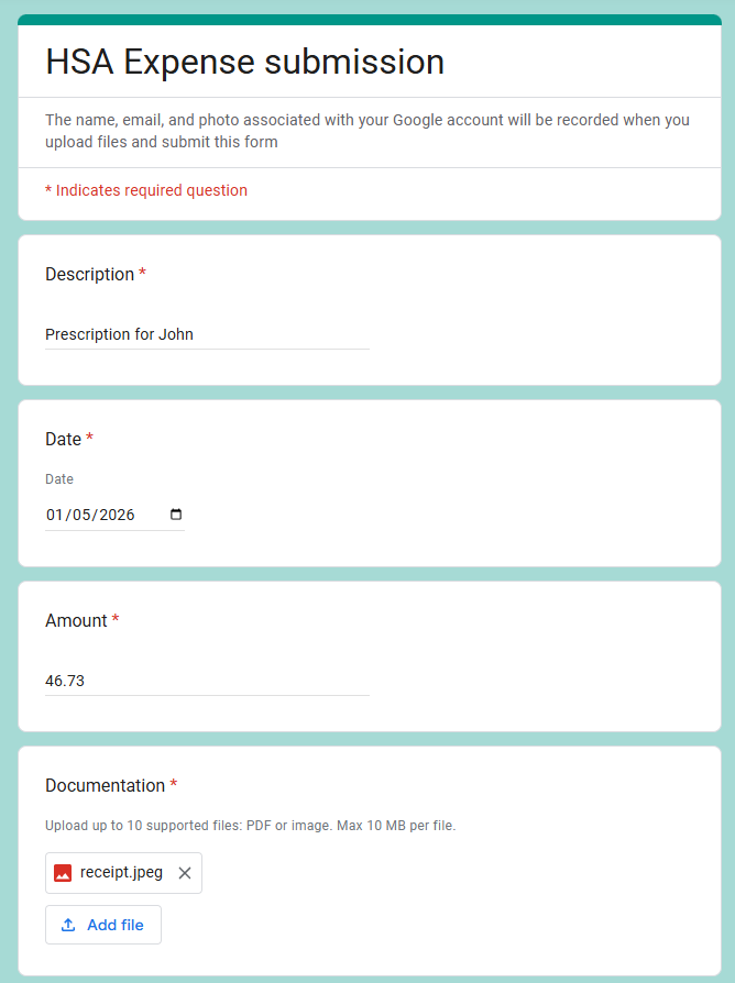 Google has a nifty tool called Google Forms. It’s like Surveymonkey built right into your Google docs suite. Create a new form for HSA expense submissions with the following fields: